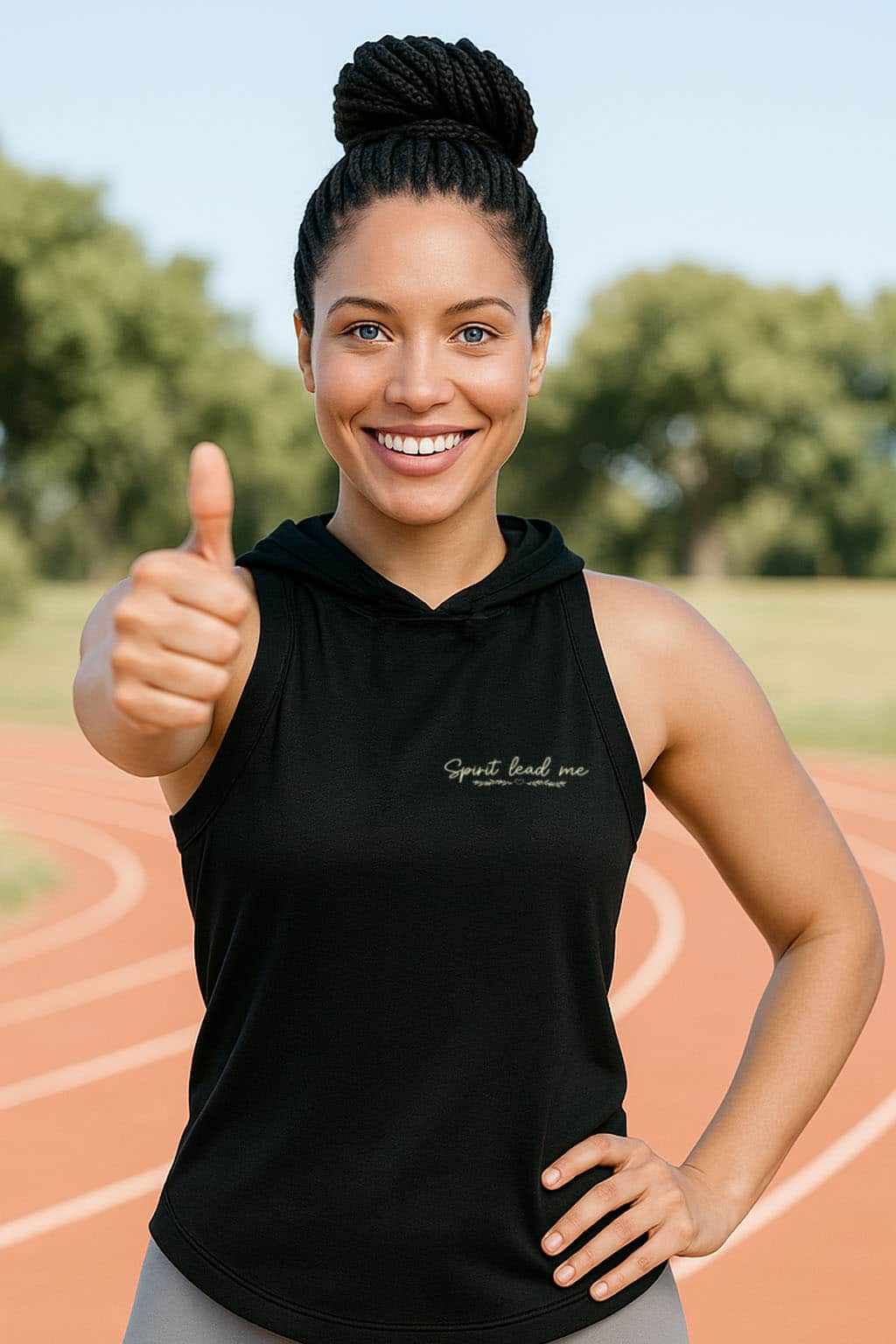Designed with a soft tri-blend feel and breathable performance details, this hoodie tank keeps you comfortable and confident through movement, reflection, and everything in between. Moisture-wicking fabric, mesh paneling, and a modern silhouette create a versatile piece that effortlessly transitions from your devotion moments to your active days—always reminding you to walk where the Spirit leads.