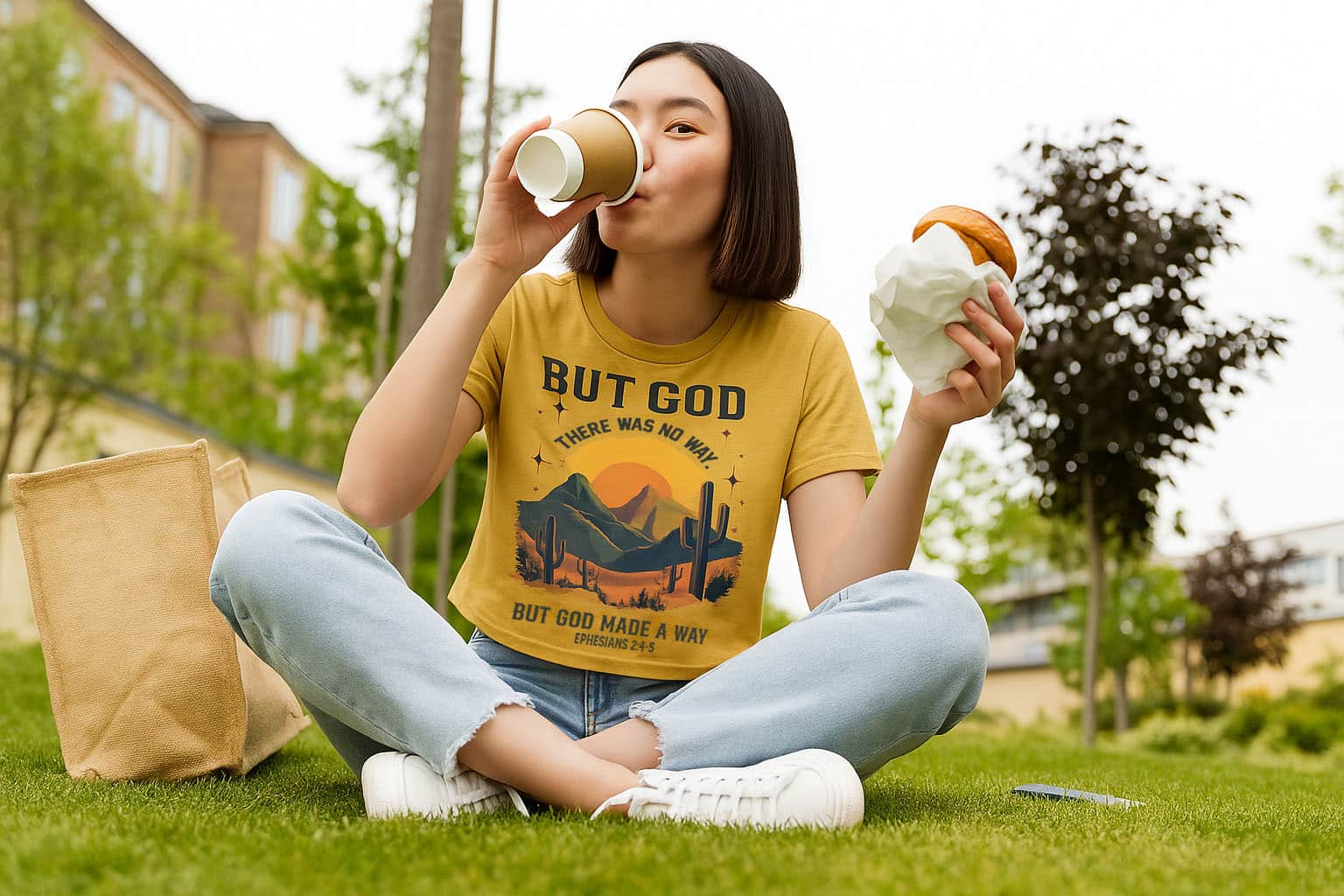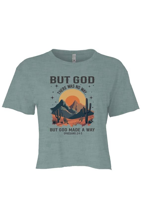 When life feels like a wilderness, remember—But God Made a Way Cali Crop Tee. Inspired by Ephesians 2:4–5, the But God Made a Way crop tee captures the beauty of divine breakthrough and unshakable faith. The desert sunrise design symbolizes new beginnings and the light that breaks through even the toughest seasons. It’s a bold yet comforting reminder that when the path seems blocked, grace clears the way.