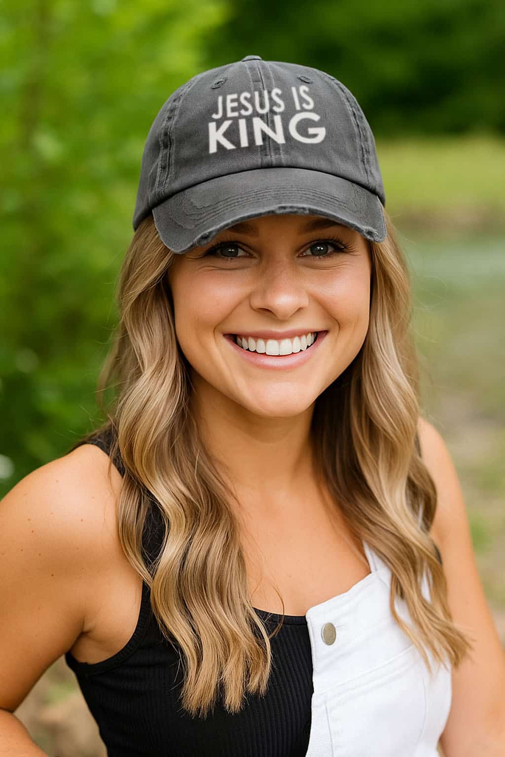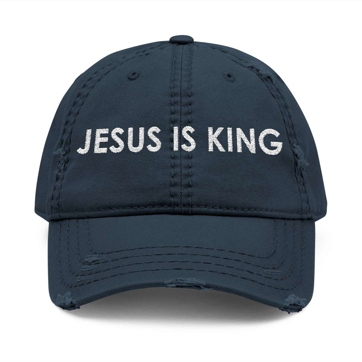This bold “JESUS IS KING” design proclaims the unshakable truth at the center of our faith—Christ reigns above all. Wear it as a joyful reminder that no matter what you face, your Savior is sovereign, victorious, and forever on the throne. Let this piece speak your confidence in His authority, your trust in His love, and your devotion to the One who rules with grace and power. Thoughtfully crafted for comfort and timeless style, this distressed dad hat features a soft, relaxed crown, breathable eyelets, and an adjustable fit that feels natural for all-day wear. Its vintage, low-profile look transitions seamlessly from Sunday gatherings to everyday moments, making it a meaningful staple for believers who love to declare who their King truly is.