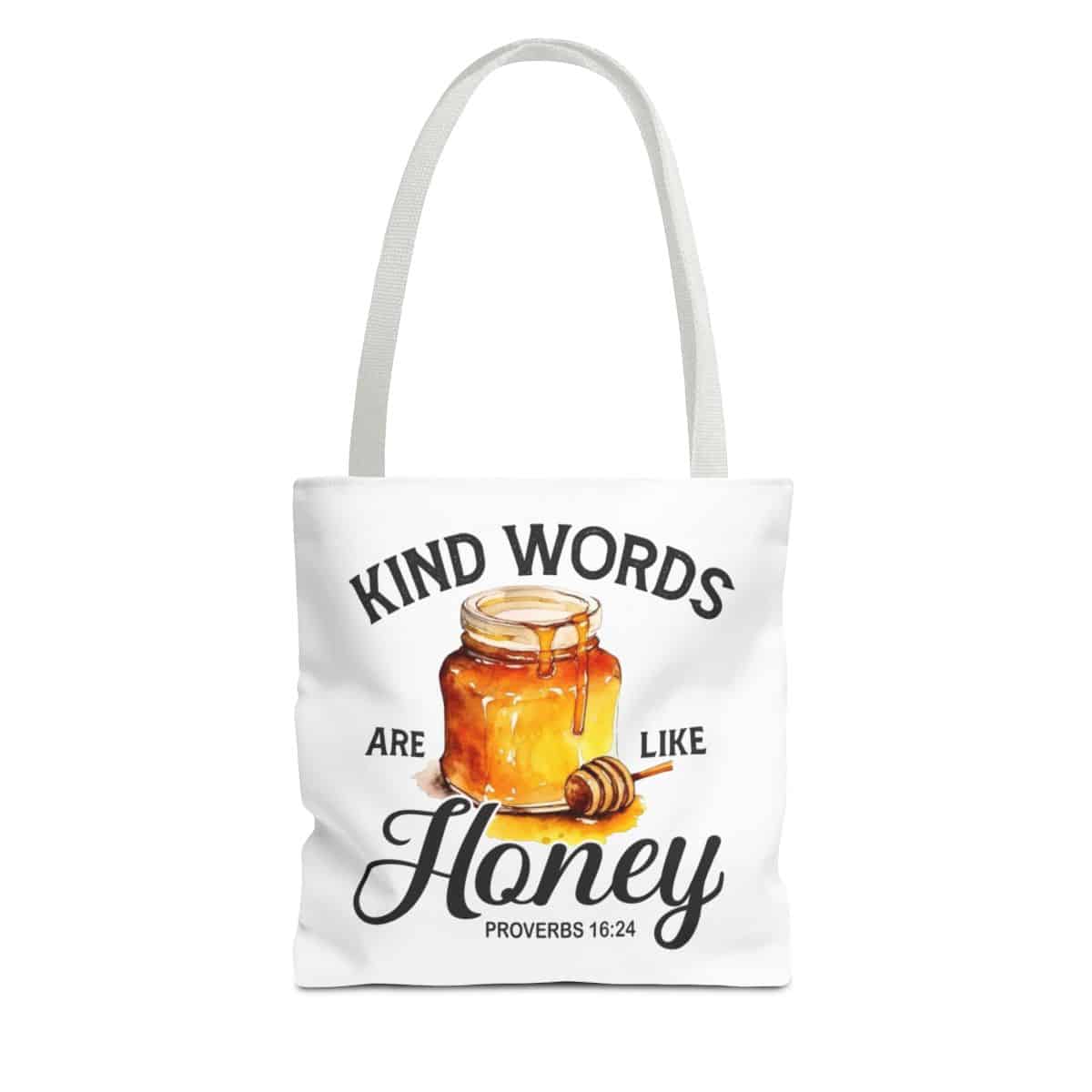 Elevate your everyday style with this charming Tote Bag, designed to bring a touch of sweetness to your outings. It features a delightful illustration of a honey jar, accompanied by the uplifting proverb ‘Kind Words are like Honey.’ Perfect for carrying your daily essentials, this tote blends functionality with heartwarming design, making it an ideal accessory for those who appreciate positivity and warmth. Whether you’re heading to the farmer’s market, running errands, or enjoying a picnic, this tote bag adds a bright note to your day. It’s a thoughtful gift for friends, family, or anyone who cherishes kindness. Perfect for birthdays, holidays, or simply as a special treat for yourself!