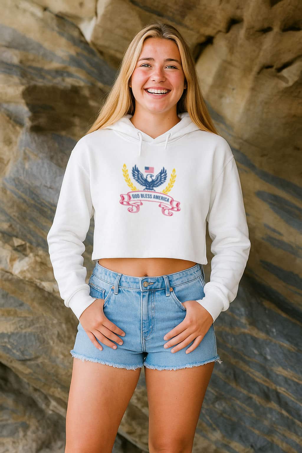 Celebrate faith, gratitude, and liberty with the God Bless America Cropped Hoodie. This bold design is more than a phrase—it’s a joyful declaration that honors our nation while lifting high the name of the Lord. Featuring an American eagle and flag wrapped in divine purpose, this hoodie reminds us that true freedom comes from above and that God’s blessings guide every step of our journey. Perfect for believers who want to combine patriotism with faith in a stylish, meaningful way.