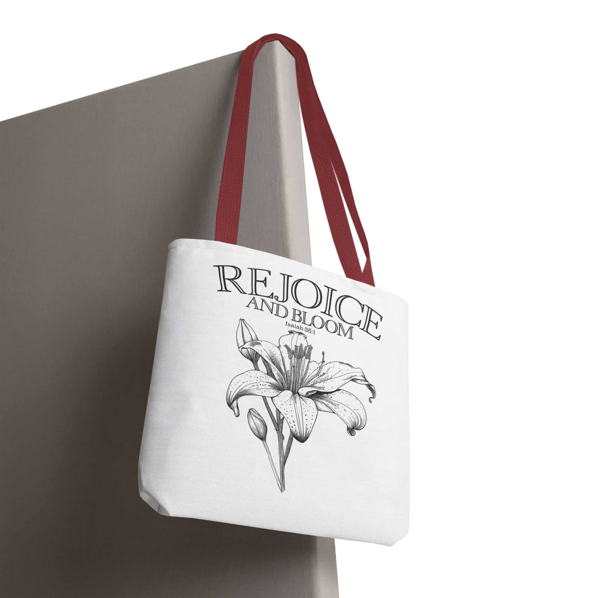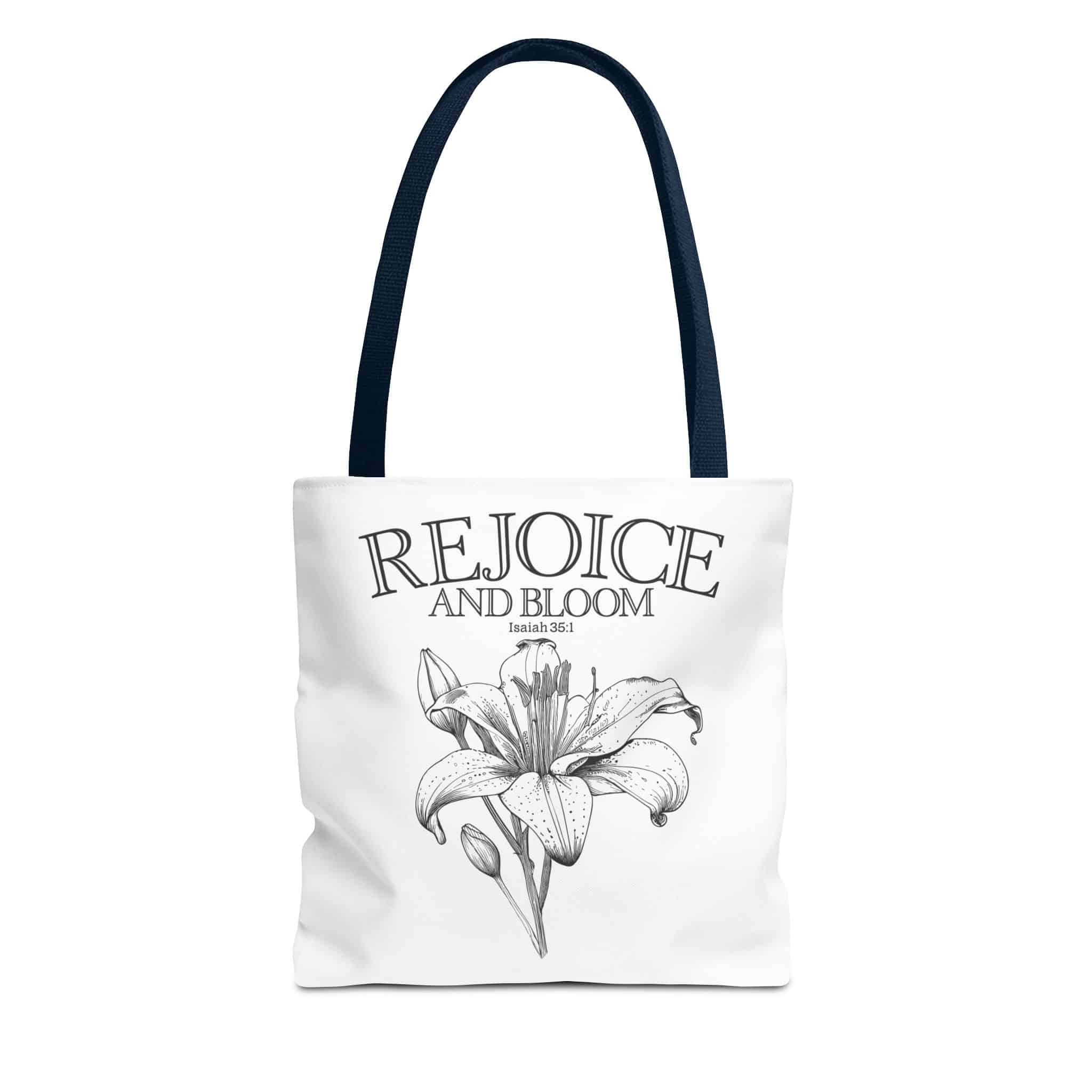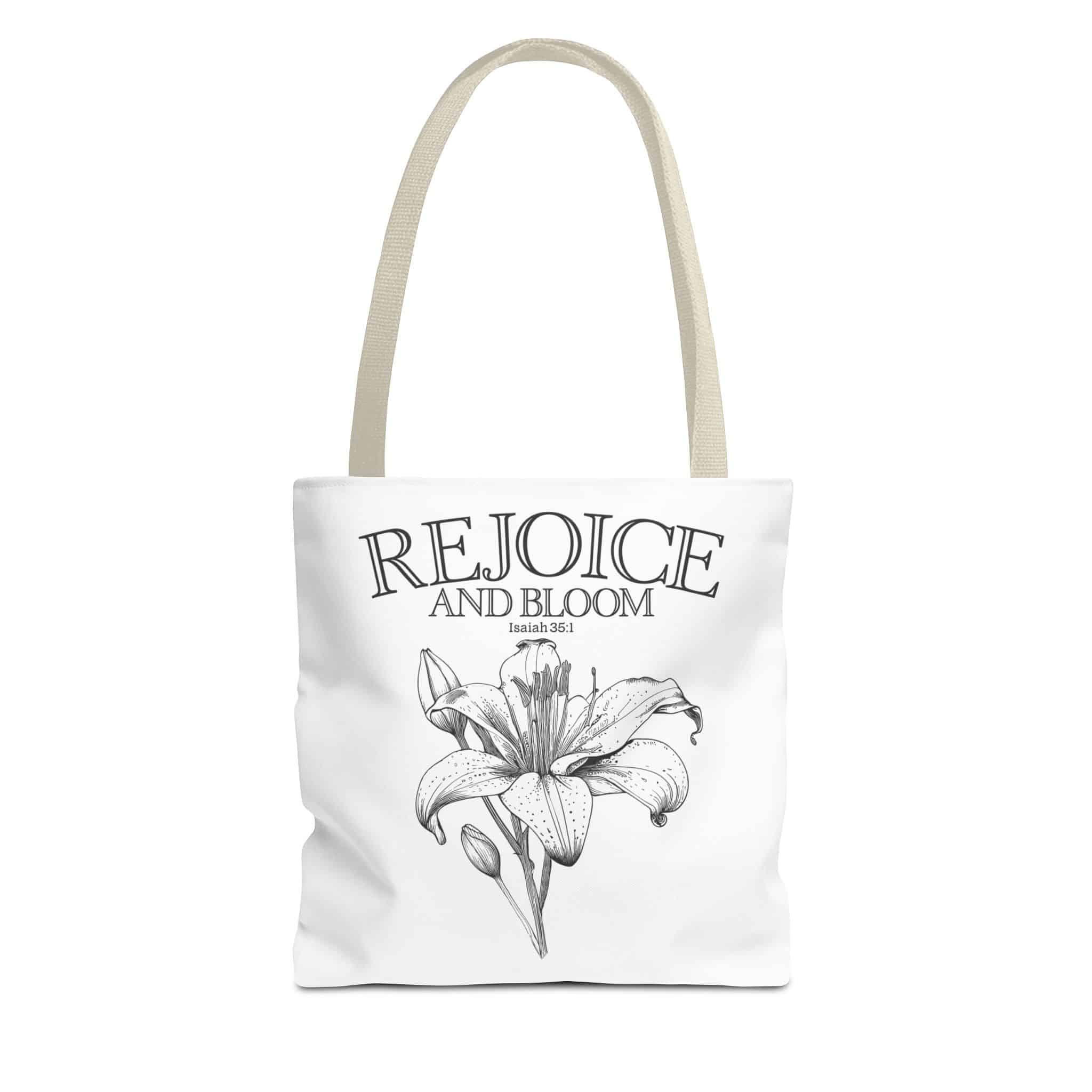 Introducing a beautifully designed Tote Bag that combines style and practicality. This chic accessory radiates positivity with its inspirational message, ‘Rejoice and Bloom‘, making it the perfect companion for everyday adventures. Crafted from durable, lightweight polyester, it is designed to withstand the rigors of daily use while maintaining its delightful shape. Ideal for carrying your essentials—whether it’s a day at the market, an afternoon at the beach, or a cozy picnic at the park.